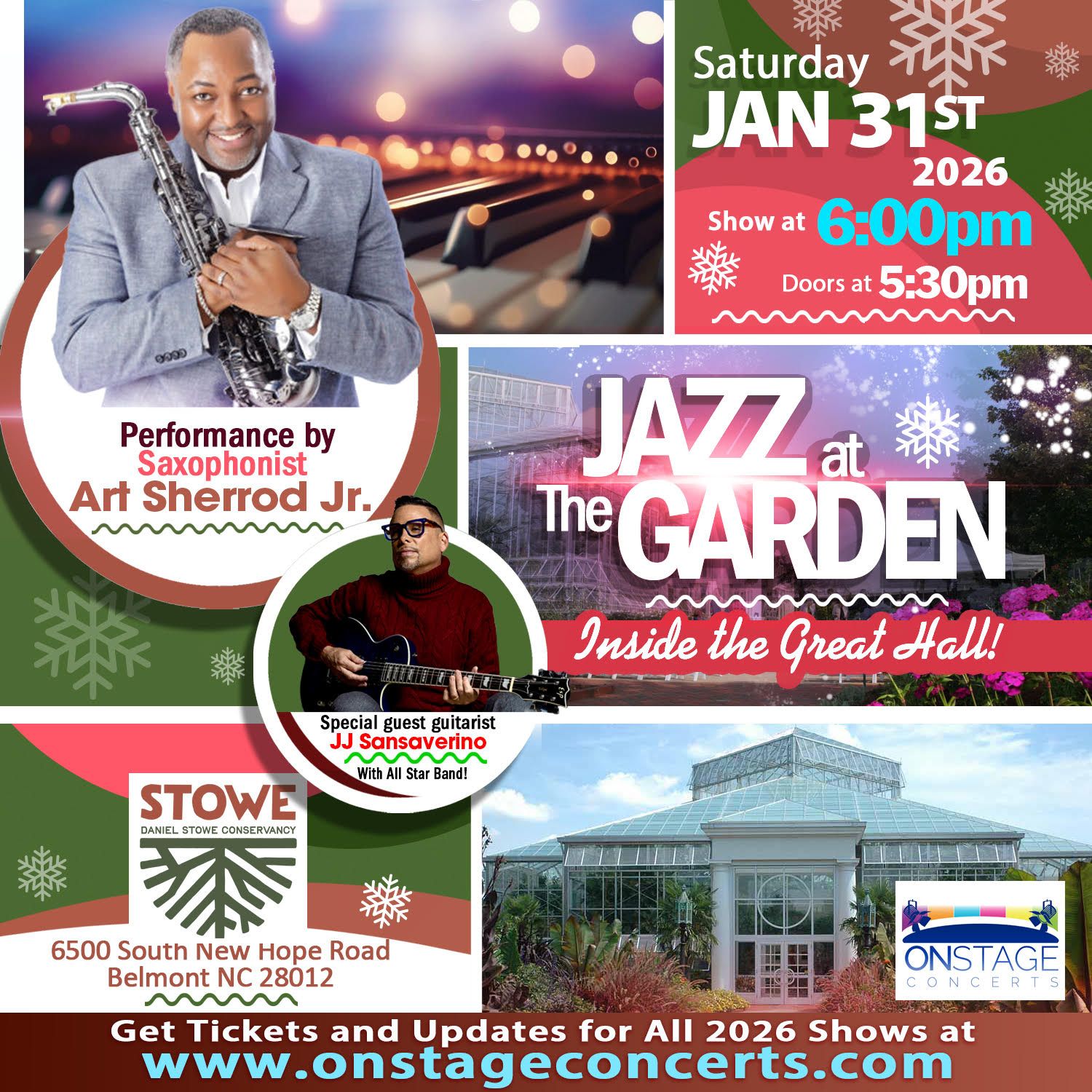 On Stage Concerts is pleased to present another Jazz at the Garden Show Inside the Great Hall with Daniel Stowe Conservancy as the new year gets into full swing! Join us Saturday, January 31st at 6pm for renowned saxophonist and Billboard charting national artist Art Sherrod, Jr! PLUS! Special guest guitarist JJ Sansaverino and an AllStar Band!