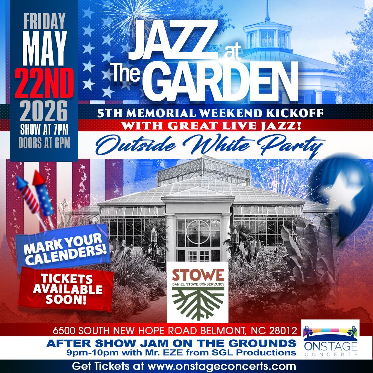 On Stage Concerts is pleased to present our 5th Memorial Weekend Kickoff and Outside White Party! A great evening of live jazz and an After Show Dance Party right on the Garden grounds! More details of the Live Jazz performance are on the way so watch for updates and mark your calendars because tickets go on sale soon!